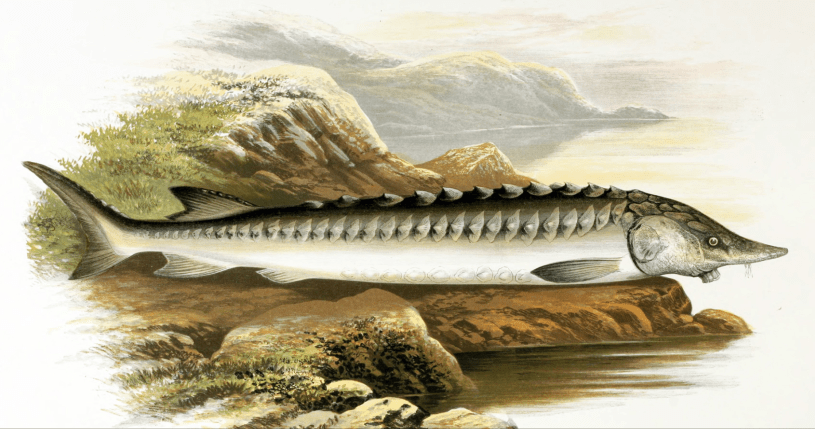 The size of an adult sturgeon would have fed many mouths. The flesh of the sturgeon that chiefly dwells in rivers is somewhat like veal and the roe furnishes caviar that appears to have been served on toast. Its air bladder furnishes isinglass that was used before gelatine to make jelly and blancmange.