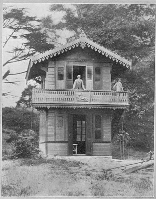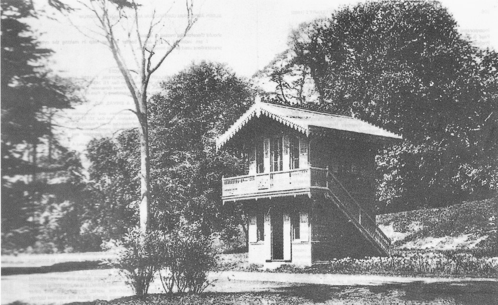 The Chalet comprised two square rooms (19 sq. ft.), one on top of the other. The upper room was reached by an outside staircase. One description stated that “each room was furnished with seats covered with purple Morocco leather and a commodious table, the walls being plain polished pine.”[6] (Some news reports talk of the ‘upper two rooms’. I suspect this is a typographical error. The statement should perhaps read the ‘upper of two rooms’. There is no evidence that the upper room had been divided into two very small ‘apartments’.)