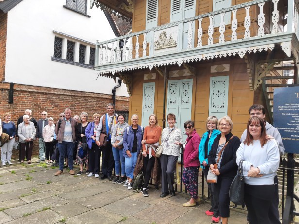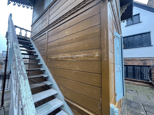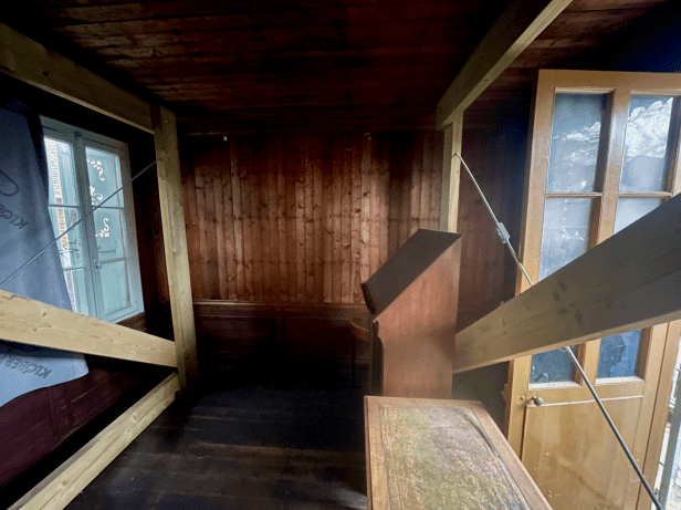 Dickens’ Swiss or writing chalet, which is now located in the grounds of Eastgate House, Rochester, has had quite a journey to get there – Innsbruck, Higham, Sydenham (South London), Cobham (Kent), and finally Rochester. During its ‘journey’, it was saved more than once from being lost to the nation and dereliction – a condition it finds itself in again. It’s screened off because of its dangerous condition; held square by huge internal beams, and the balcony being held up by a combination of wood filler and acrow props.