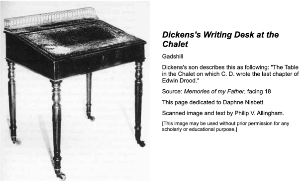 The following is claimed to be a picture of Dickens’ desk in the chalet. Doesn’t look the same. Perhaps there were two? No evidence to support this.