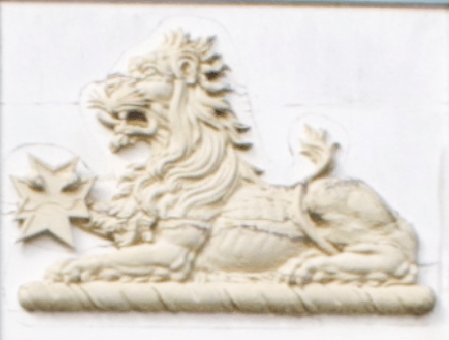 On the front of the balcony railings can be seen an ‘unofficial’ coat of arms/family crest. It seems that John Dickens, father of Charles, and probably the basis of Mr Micawber, appropriated the crest of William Dickens—a merchant and first cousin once removed of John. It was of a laying-down lion holding a “cross patonce”. In 1840, Charles Dickens commissioned John Overs, a cabinet maker, to redesign the crest—replacing the cross patonce with a Maltese cross. The history suggests Charles did this to separate himself from his profligate father.[24]