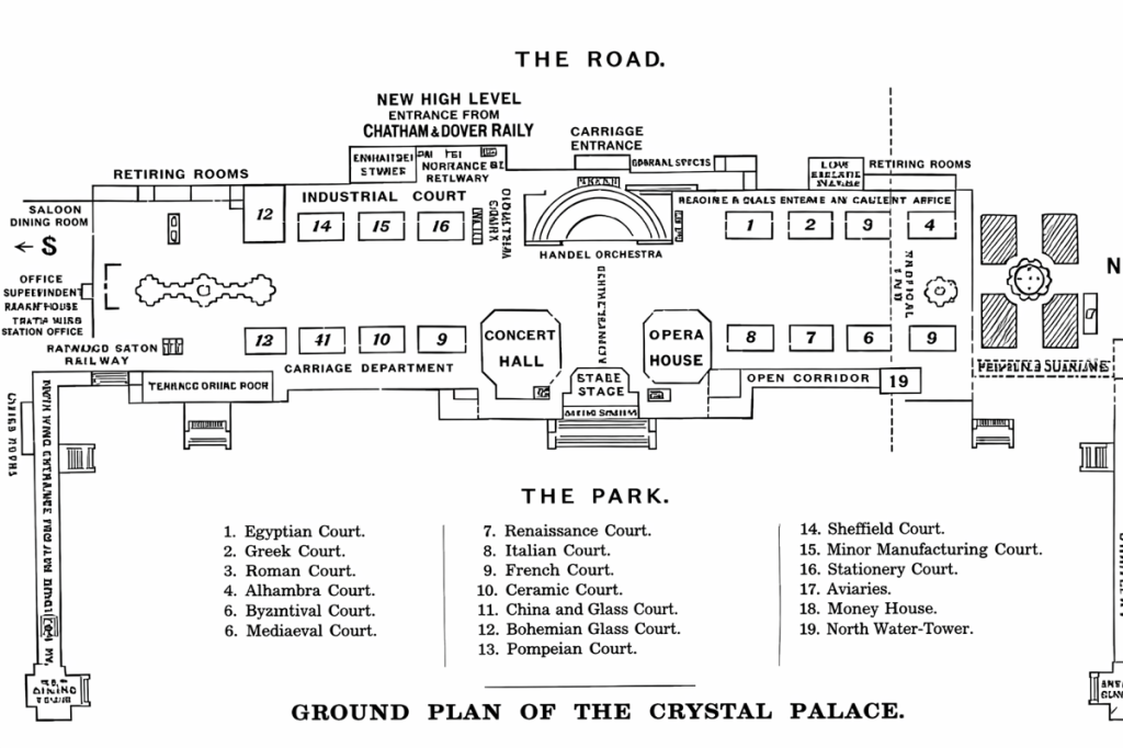 [48] As indicated by “Crystal Palace – a guide to the Palace & Park”. Printed by Charles Dickens and Evans, Crystal Palace Press. Particularly p19