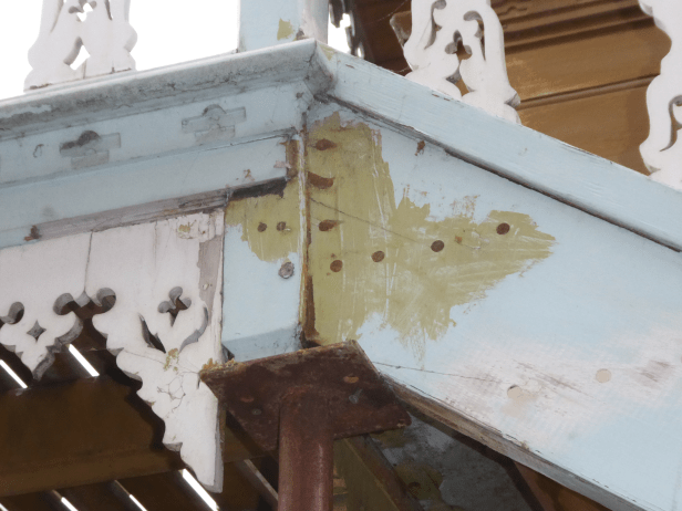 - Sadly, the chalet is on ‘life-support’ again, held upright/square by huge internal beams, and the balcony being held up by a combination of wood filler and acrow props.