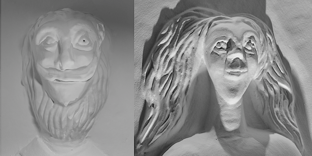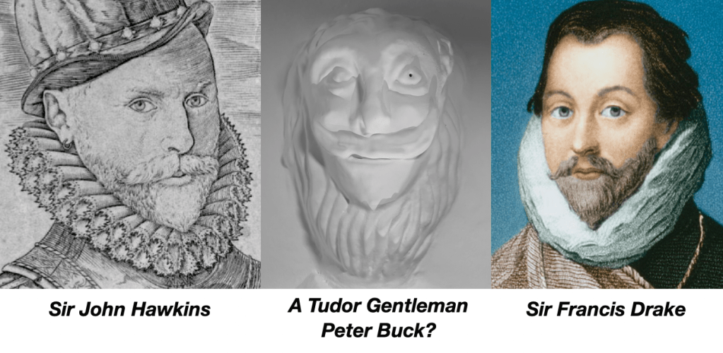 Comparing the ‘sculptured face’ with contemporaneous portraits of Sir Francis Drake and Sir John Hawkins, the similarities are noticeable. All have a Peak de Bon beard and a curled-up moustache. The ruffs of Francis Drake and the representation of a ruff surrounding the sculpted head are not dissimilar.