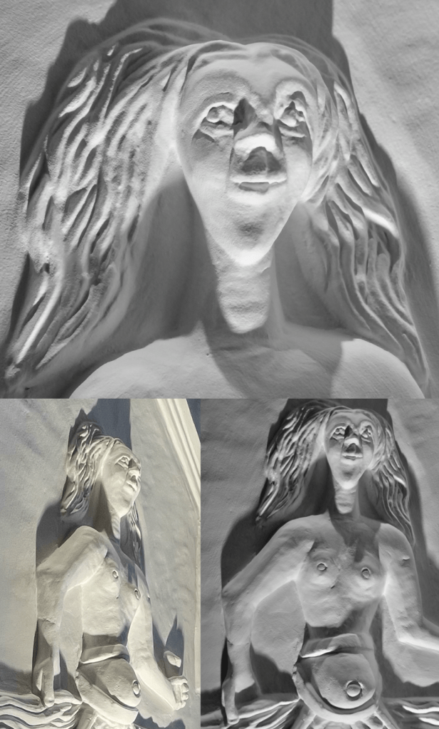 It is the Melusines that I’ve looked at most closely. Melusines are mythical creatures rather like mermaids, but having two tails. They are usually female. Unlike mermaids, which are symbols of list and vanity, Melusines in the Tudor period could be used as an allegory for a mother or provider of heirs. However, one of the pair at Eastgate House is clearly male.