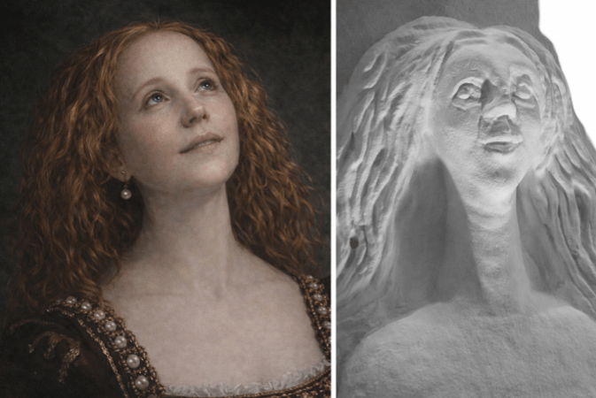 Just for fun! I asked ChatGPT to reconstruct a face based on the images I took of the Melusine faces in the ceiling of Eastgate House. I ‘told’ AI that the images were a cast of faces. I also told it that they lived in the Tudor period and that the male was middle-aged and the female was aged about 30. This is what it came up with: